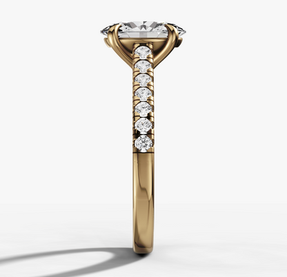 Our signature French pave exudes absolute elegance when lifted on the cathedral setting. It showcases a sleek pave band that beautifully complements the stunning centre oval cut diamond.