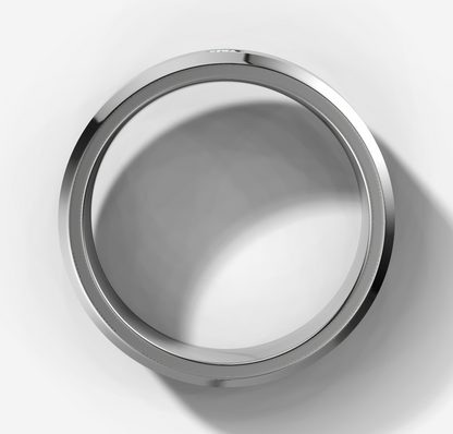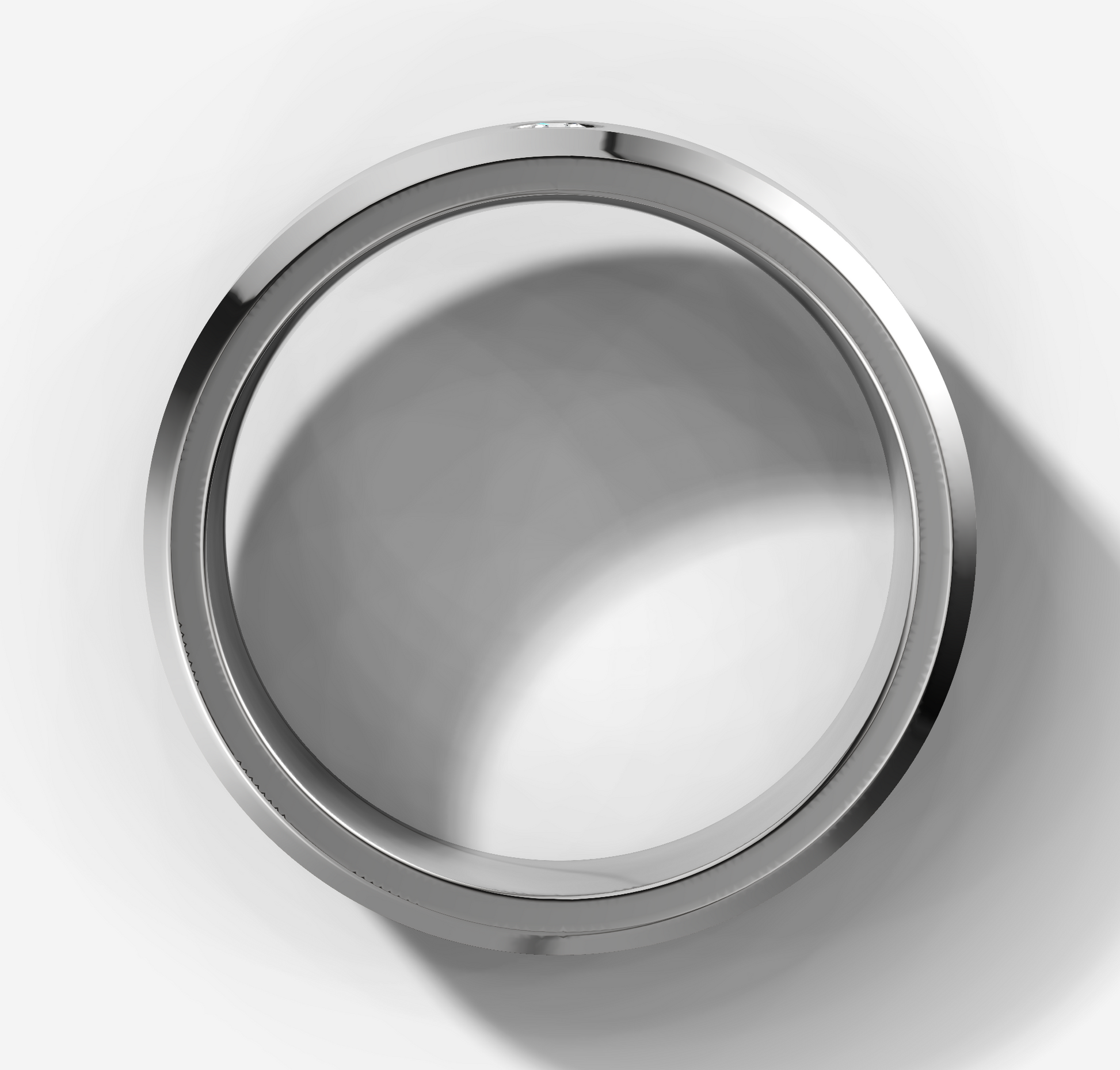 This unique band has a flat profile with beveled edges, featuring a hammer set 0.05ct round brilliant cut diamond. The band measures 5mm in width.