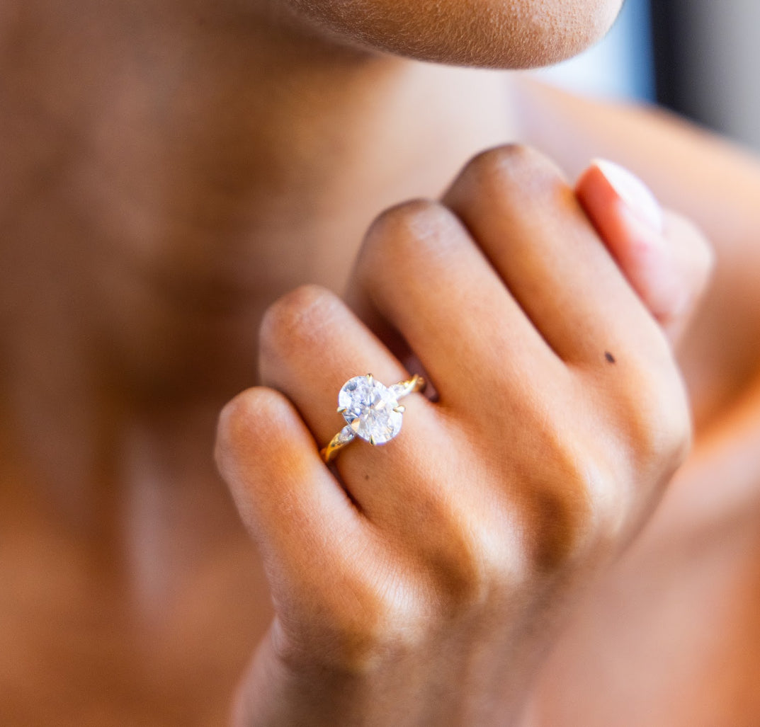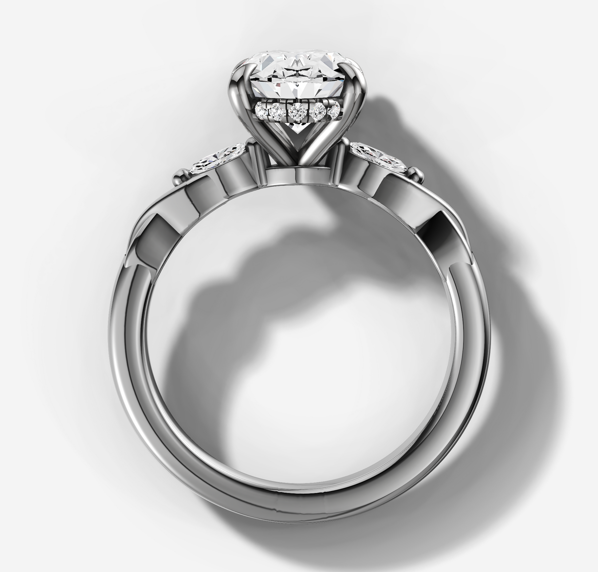 Delicate marquise diamonds are prong set on each shoulder of the ring, enhancing its elegance, while a subtle twist in the band adds an enchanting touch. The oval cut center diamond is beautifully complemented by a delicate hidden halo, creating a stunning overall effect.